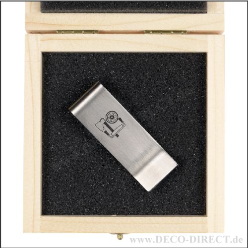 Handwerkergeschenk Geldscheinklammer Wagner aus Edelstahl, 57 x 20 x 9 mm, in Holz-Geschenkverpackung (9,5 x 9,5 x 3,5 cm), Gravurempfehlung: Initialen auf Geldscheinklammer / Text auf Verpackungsaußenseite, Bestellnummer: 58320125