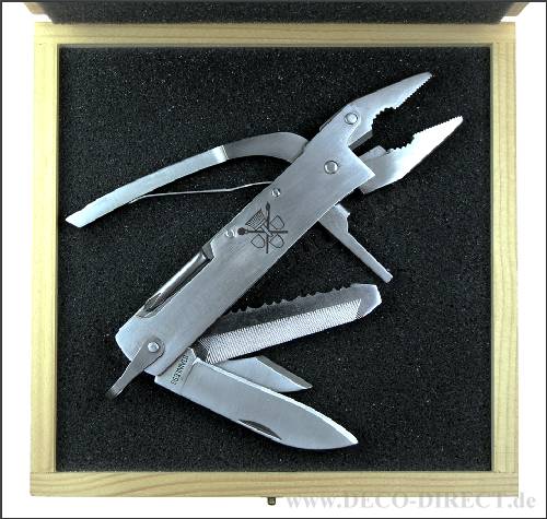 Handwerkergeschenk Multifunktionswerkzeug 2 Maler aus Edelstahl mit 10 Funktionen, in Holz-Geschenkverpackung (16,5 x 16,5 x 3,5 cm), zusätzl. Gravur-Empfehlung: auf Verpackung, Bestellnummer: 72220255