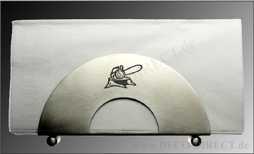 Handwerkergeschenk Serviettenhalter Motorsäge aus Edelstahl, Maße: 15,0 x 8,0 x 3,0 cm, in Metall-Geschenkbox (15,0 x 15,0 x 6,1 cm), Gravurempfehlung: auf Serviettenhalter, Bestellnummer: 76320250