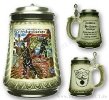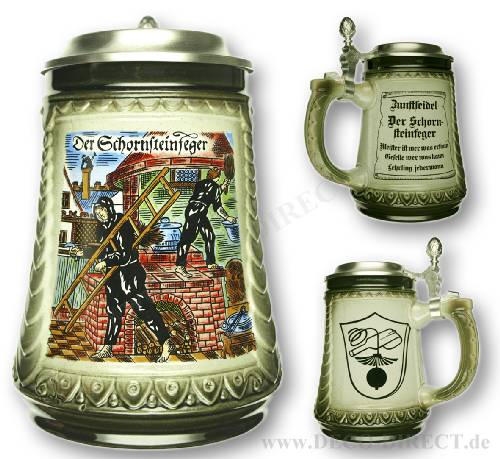 Handwerkergeschenk Zunftseidel Der Schornsteinfeger mit Zinndeckel, Zunftzeichen und Meisterspruch Meister ist wer was ersann, Geselle wer was kann, Lehrling jedermann, 0,5 l, aus Keramik grau/grün, Höhe ca. 17 cm, Gravurempfehlung: auf Zinndeckel, Bestellnummer: 74200211