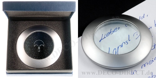 Handwerkergeschenk Briefbeschwerer Sattler mit Lupe und Chrom-Rand, Ø 8,5 cm, in exklusiver Geschenkverpackung, Gravurempfehlung: auf Briefbeschwerer / Schild auf Geschenkverpackung, Bestellnummer: 72280210