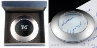 Handwerkergeschenk Briefbeschwerer Schlosser mit Lupe und Chrom-Rand, Ø 8,5 cm, in exklusiver Geschenkverpackung, Gravurempfehlung: auf Briefbeschwerer / Schild auf Geschenkverpackung, Bestellnummer: 72280810