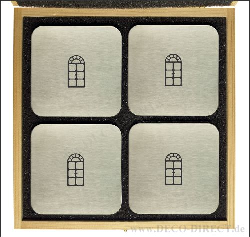 Handwerkergeschenk 4er-Set Untersetzer Fensterbauer aus Edelstahl, quadratisch mit abgerundeten Ecken, jeweils 95 x 95 mm, in exklusiver Holz-Geschenkverpackung (22,5 x 22,5 x 3,5 cm), Gravurempfehlung: auf Untersetzer / auf Holz-Geschenkverpackung, Bestellnummer: 76151520