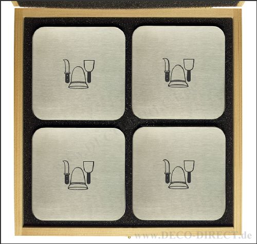 Handwerkergeschenk 4er-Set Untersetzer Hutmacher aus Edelstahl, quadratisch mit abgerundeten Ecken, jeweils 95 x 95 mm, in exklusiver Holz-Geschenkverpackung (22,5 x 22,5 x 3,5 cm), Gravurempfehlung: auf Untersetzer / auf Holz-Geschenkverpackung, Bestellnummer: 76170820