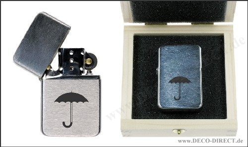 Handwerkergeschenk Benzin-Feuerzeug Schirmmacher aus Metall mit gebürsteter Oberfläche, ca. 5,7 x 3,6 x 1,2 cm, nachfüllbar mit Feuerzeugbenzin (Lieferung aus Sicherheitsgründen ungefüllt), in Holzverpackung (9,5 x 9,5 x 3,5 cm), Gravurempfehlung: auf Verpackung, Bestellnummer: 72283870