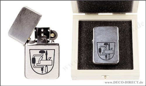 Handwerkergeschenk Benzin-Feuerzeug Schreiner 1 aus Metall mit gebürsteter Oberfläche, ca. 5,7 x 3,6 x 1,2 cm, nachfüllbar mit Feuerzeugbenzin (Lieferung aus Sicherheitsgründen ungefüllt), in Holzverpackung (9,5 x 9,5 x 3,5 cm), Gravurempfehlung: auf Verpackung, Bestellnummer: 72281270