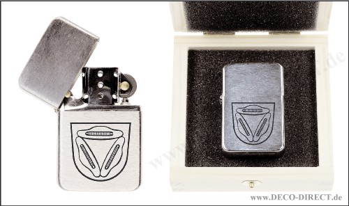 Handwerkergeschenk Benzin-Feuerzeug Weber 1 aus Metall mit gebürsteter Oberfläche, ca. 5,7 x 3,6 x 1,2 cm, nachfüllbar mit Feuerzeugbenzin (Lieferung aus Sicherheitsgründen ungefüllt), in Holzverpackung (9,5 x 9,5 x 3,5 cm), Gravurempfehlung: auf Verpackung, Bestellnummer: 72320470