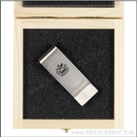 Handwerkergeschenk Geldscheinklammer Bürstenbinder aus Edelstahl, 57 x 20 x 9 mm, in Holz-Geschenkverpackung (9,5 x 9,5 x 3,5 cm), Gravurempfehlung: Initialen auf Geldscheinklammer / Text auf Verpackungsaußenseite, Bestellnummer: 58111525