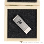 Handwerkergeschenk Geldscheinklammer Gerber 2 aus Edelstahl, 57 x 20 x 9 mm, in Holz-Geschenkverpackung (9,5 x 9,5 x 3,5 cm), Gravurempfehlung: Initialen auf Geldscheinklammer / Text auf Verpackungsau ...
