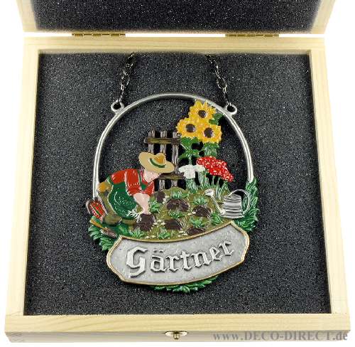 Handwerkergeschenk Zinnbild Gärtner oval, H: 11,0 cm, in Holz-Geschenkverpackung (16,5 x 16,5 x 3,5 cm), Gravur-Empfehlung: auf Verpackungsaußenseite, Bestellnummer: 12-02-180V