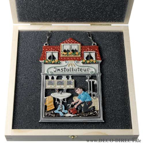 Handwerkergeschenk Zinnbild Installateur, H: 13,0 cm, in Holz-Geschenkverpackung (16,5 x 16,5 x 3,5 cm), Gravur-Empfehlung: auf Verpackungsaußenseite, Bestellnummer: 12-02-238V