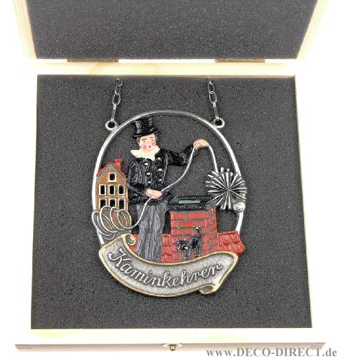 Handwerkergeschenk Zinnbild Kaminkehrer oval, H: 11,0 cm, in Holz-Geschenkverpackung (16,5 x 16,5 x 3,5 cm), Gravur-Empfehlung: auf Verpackungsaußenseite, Bestellnummer: 12-02-190V